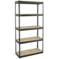 Angle post design and L beam design. Adjustable particle board shelves. Use as a shelf or workbench. Corrosion resistant powder coat finish. No nuts or bolts. Holds up to 250 pounds per shelf.